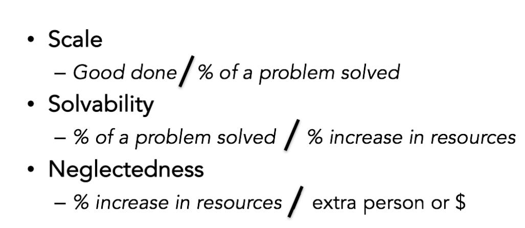 Here we see the typical effective altruist quantitative mindset. You (usually) can’t put exact numbers on tractability or neglectedness; very few people actually try to solve the equation. But effective altruists still think about doing good as a math problem. In principle, if you were a nigh-omniscient god of social science, you could plug in numbers and solve for morality.